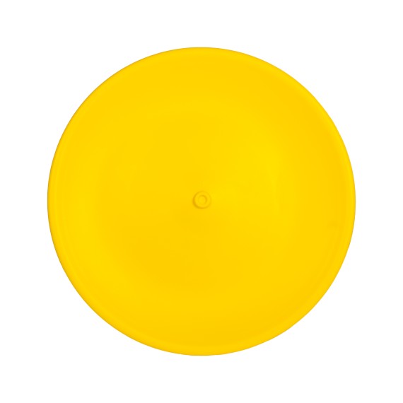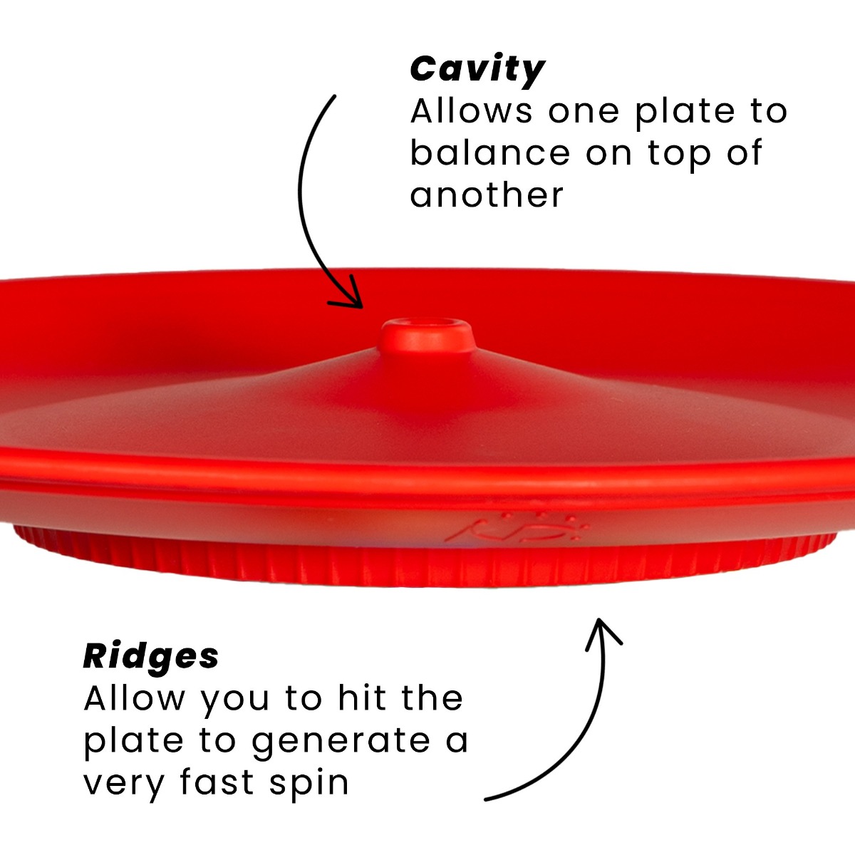 Aan de onderzijde zitten ribbels, zodat je het bord kunt aantikken om extra snelheid te geven en zo een extreem lange draaitijd te creëren.