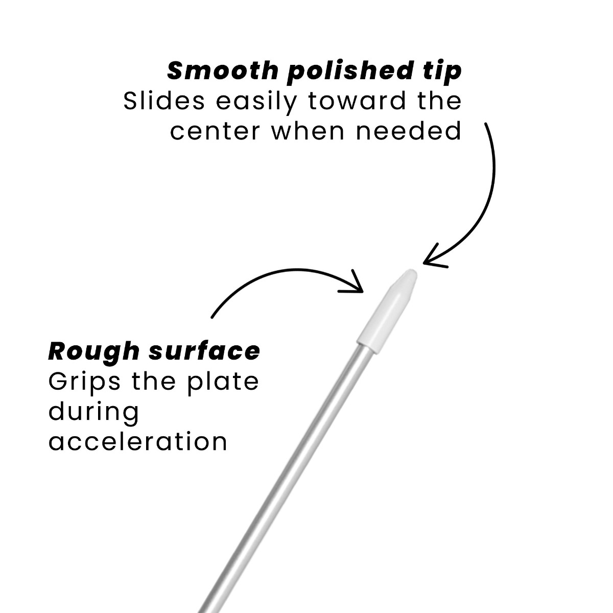 De punt van de stok is aan de bovenkant gepolijst en aan de zijkant licht ruw: dit zorgt voor goede grip bij het versnellen en laat de stok soepel naar het midden glijden wanneer nodig.