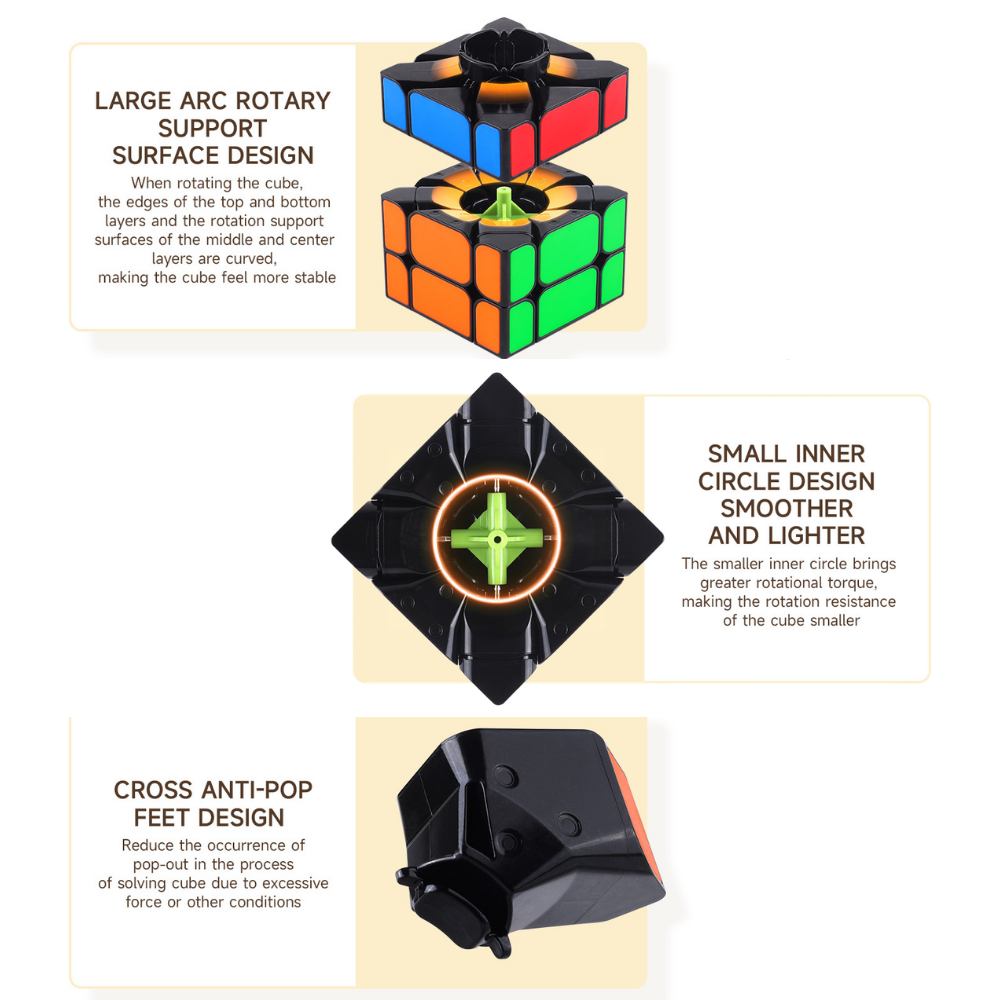 Wat deze “S”-versie onderscheidt, is de verbeterde bouwkwaliteit en afwerking. In plaats van stickers gebruikt deze cube duurzame plastic tiles, waardoor kleuren niet vervagen of loslaten en de puzzel langer mooi blijft. Daarnaast beschikt de cube over een modern intern mechanisme met zogenaamde Florian-style stukken, wat zorgt voor soepel draaien en goede corner cutting.