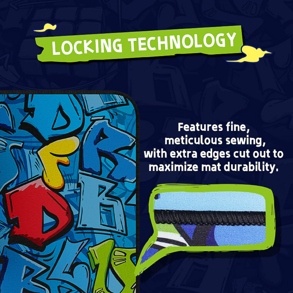 De mat heeft een speciaal graffiti‑kunstwerk waarop kubusmotieven verwerkt zijn, wat hem visueel aantrekkelijk maakt bovenop zijn functionele eigenschappen.