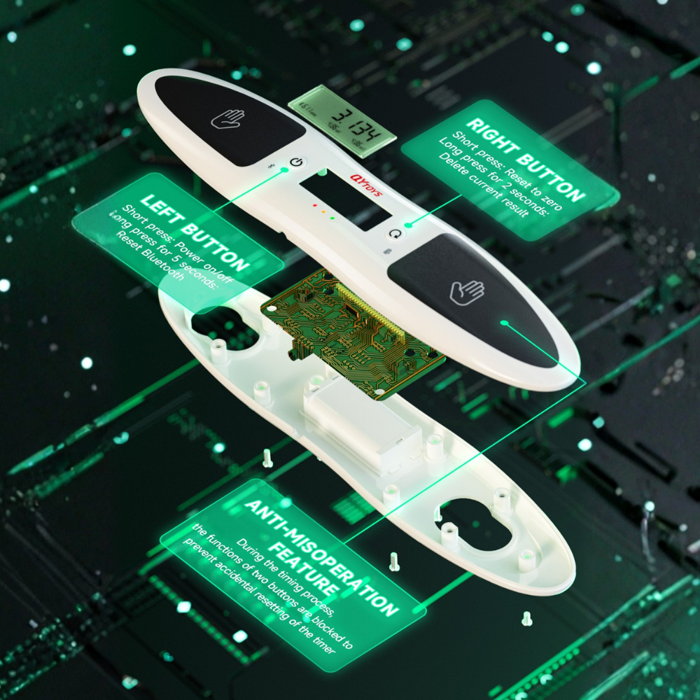 De timer gebruikt capacitieve sensoren in plaats van mechanische knoppen, wat zorgt voor een moderne en consistente start/stop ervaring.