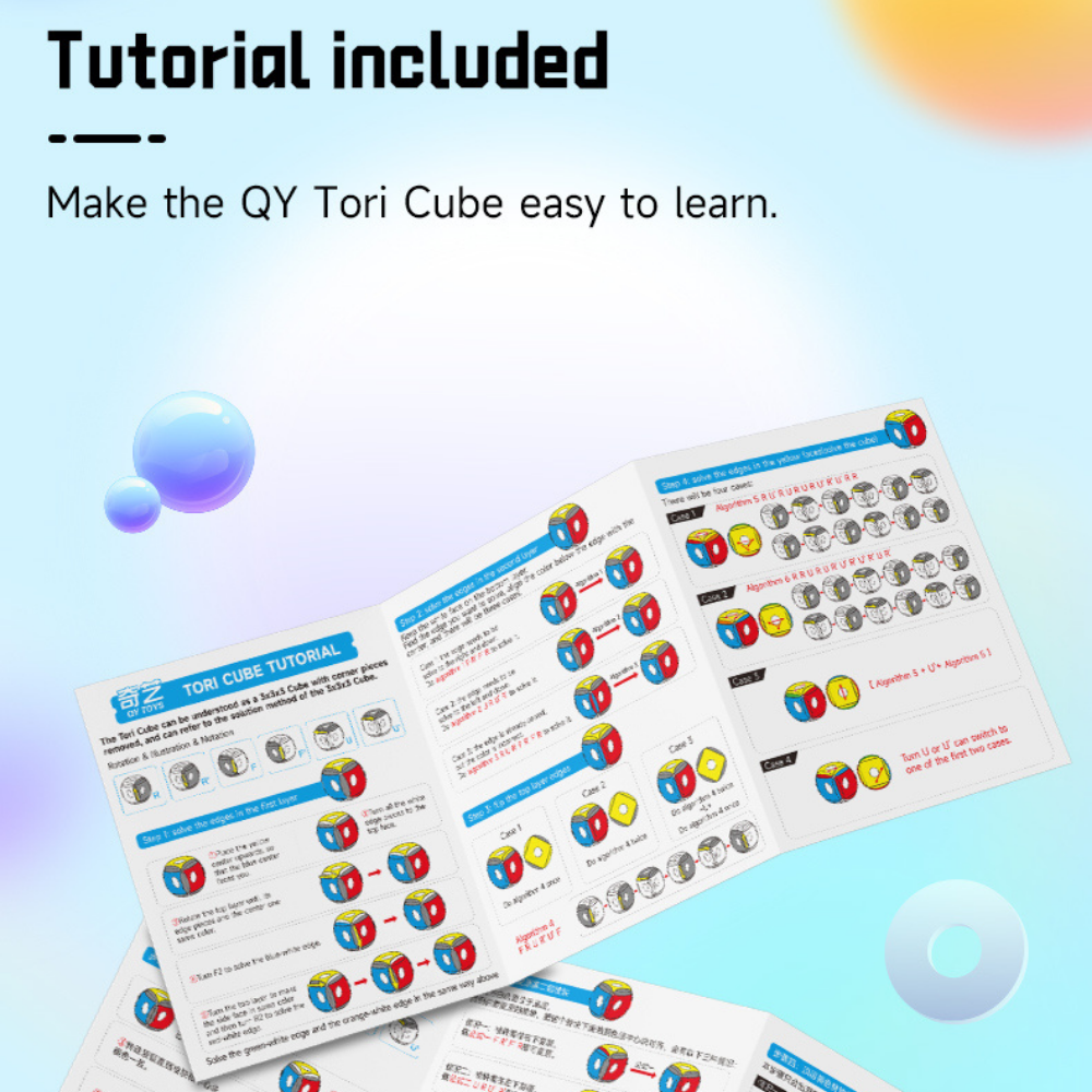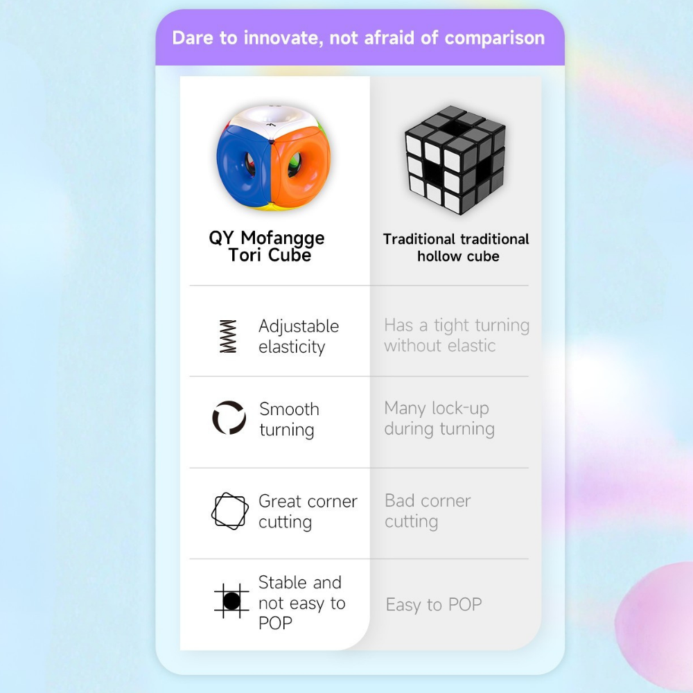 De QiYi Tori Cube is een creatieve en mechanisch unieke twisty puzzel van QiYi die afwijkt van een traditionele kubus. Hoewel hij verwant is aan een 3×3 kubus, heeft hij een uitgehold ontwerp met grote openingen in het midden van elke zijde, wat hem een opvallende en futuristische uitstraling geeft. Dit lijkt op een void‑cube‑achtig effect, maar het is geen echte void cube omdat het een 3×3 zonder hoekstukken is en er toch kleuren aanwezig zijn die je moet oplossen.