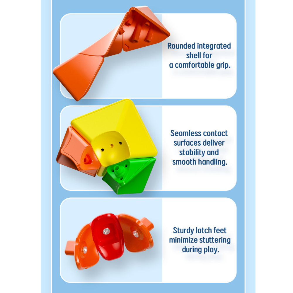 Hoewel de basis vaak nog gebaseerd is op een 3×3-achtig mechanisme, zorgt het ontwerp ervoor dat de puzzel tijdens het draaien visueel complexer wordt. Hierdoor moet je niet alleen letten op kleuren, maar ook op de vorm en oriëntatie van de stukken.